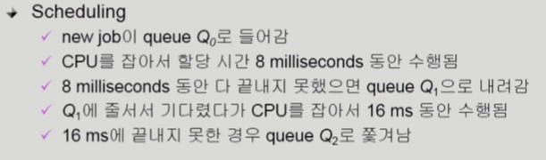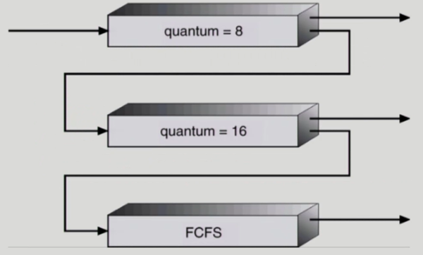 그리고 RR으로 quantum을 점차 길게 Queue를 두게 됩니다. 그리하여 프로세스가 삽입되었을 때 시간이 초과되면 아래의 RR으로 강등시키는 과정을 반복합니다.